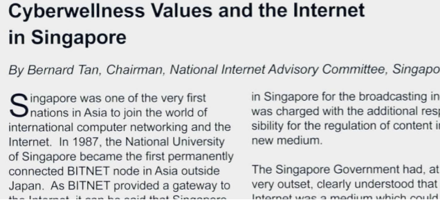 By Bernard Tan, Chairman, National Internet Advisory Committee, Singapore Singapore was one of the very first nations in Asia to join the world of international computer networking and the Internet. In 1987, the National University of Singapore became the first permanently connected BITNET node in Asia outside Japan. As BITNET provided a gateway to the Internet, it can be said that Singapore then truly joined the international networking community.